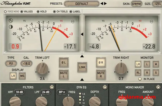 立体声通道上 GUI 的所有控件,您可以在单仪表和双仪表之间切换显示