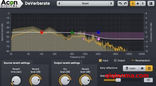 版本 2 的混响减少算法包含在音乐和其他音频源中。两种算法都将传入的音频分为直接声音和混响声音的估计,然后可以自由地重新组合。此外,还包括一个独特的早期反射滤波器,可与混响抑制算法结合使用。早期反射滤波器使用复杂的统计方法来估计所谓的早期反射脉冲响应,然后用于抵消早期反射的影响。