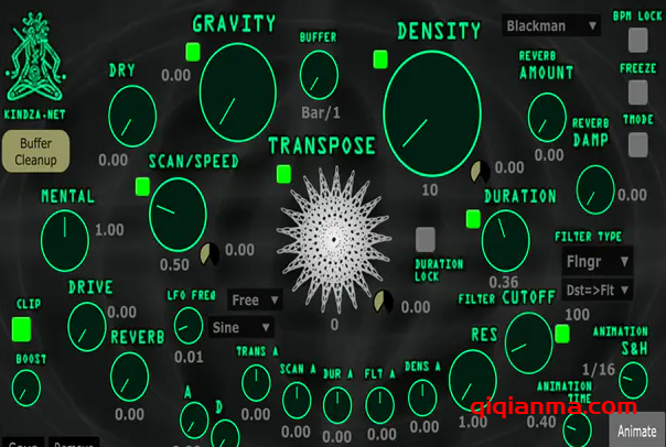 主要控件是 Transpose,用于移调音频。密度、颗粒量、BPM 将其合成为 BPM。Position Scan,音频缓冲区扫描。持续时间、颗粒持续时间、Dur.Lock 颗粒大小取决于密度,因此它们不会重叠。A、D、R是控制单颗粒的上升衰减和释放,这个控制很微妙,存在的目的是为了防止点击。还提供用于移调和扫描的 Lfo。大按钮附近的小按钮是参数的立体移位。动画是实时动画的几个参数,动画速度A时间,Anim SH采样动画与bpm同步。RND 参数瞬时随机化。动画期间,动画参数不可控制。BUffer,保存音频的缓冲区大小。冻结))