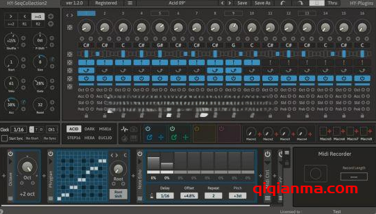 这是一个多模式音序器插件。 有 6 种音序器模式可用(Acid、Dark、M5816、Step16、Hexa、Euclid)。 有 4 个调制信号发生器和 8 个可用于参数调制的宏控件。