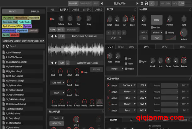 TAL-Sampler is not just a sample player. It’s a full featured analog modeled synthesizer with a sampler engine as sound source, including a powerful modulation matrix and high quality self-oscillating filters.