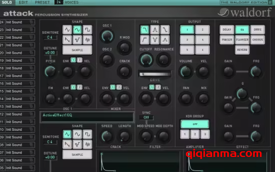 值得一提的是,经典的 “Waldorf Edition”(瓦尔德福精选套装)虽历经视觉焕新,但其核心价值始终未变,且无可替代 —— 这三款极具启发意义的软件乐器,堪称 “神圣三位一体”!如今,所有插件均配备了彻底革新的用户界面。此外,“Attack”(打击乐合成器)还新增了异常丰富的效果器板块,包含延迟(Delay)、均衡器(Equalizer)、失真驱动(Drive)、移相器(Phaser)、镶边器(Flanger)、合唱(Chorus)以及混响(Reverb)效果。