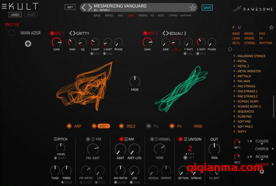 KULT中独特的OSC可以创建各种声音。它们的声音可以通过直观的FM和AM合成进一步塑造,与自然有机源完美互动。扩展滤波器部分包括一个用于每个声音的共振峰滤波器、两个由失真级控制的梳状滤波器和一个带有两个连接级的模拟滤波器。