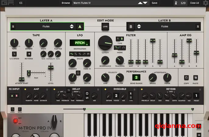 GForce 的 M-Tron Pro IV 深入研究了标志性的 Mellotron M400,这是一种基于磁带的键盘,因其在披头士乐队、Led Zeppelin、Radiohead、Oasis、Trent Reznor、Trentemøller、AIR、Nils Frahm 等著名艺术家的录音中使用而闻名其他的。其独特的声音被广泛应用于前卫摇滚和独立摇滚等流派,还有低保真和嘻哈音乐。