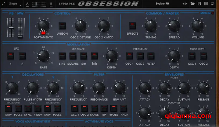 Obsession 是一个强大的老式合成器仿真。它从经典的合成器设计开始,包括两个振荡器、一个可切换的二/四极低通滤波器、两个 ADSR 包络发生器和两个 LFO,所有这些都是从硬件精心建模的。