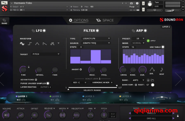 该库配备了一个适应性强的LFO系统,具有可选择的LFO形状,调制目标参数,速度,强度,节奏同步和渐近时间。您还可以选择12个低通,高通和FX滤波器,具有可分配的调制目标,如速度,modwheel,表达式,后触,键位置和步进序列表控制。我们可定制的arpeggiator提供了一个速度表和控制arp方向,定时,摆动,随机化和持续时间。我们已经包括了一个键和尺度锁定系统,以约束您的音符到常见的尺度和键,轻松的旋律组成和现场表演。