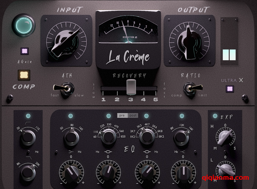 – EQ 部分可放置在压缩器之前或之后,提供音乐频率选择以快速剪切或增强。