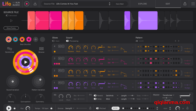 Life by XLN Audios 易于使用的工作流程是使用机器学习模型实现的,为节拍和声音变化以及密度、切分音和对称控制等功能提供支持。