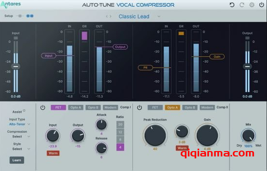 通过内置的 Warm 功能将管饱和和谐波的舒适氛围应用于一个或两个压缩器的人声。