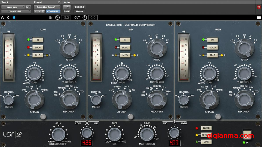354E的Nuke模式是摇滚乐的发源地。这就像在鼓室麦克风上扔 TNT。使用 Nuke 模式来破坏房间氛围并使鼓声像手提钻一样泵送。使用内置滤波器保护低音频率免受压缩,将室内麦克风中的底鼓膨胀到怪物大小。然后调整三个频段的比例和增益控制,以平衡踩镲和钹的电平与陷阱鼓的电平以实现完美融合。