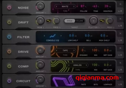 • 六个可重新排序的模块,助您构建自定义效果器机架:驱动、电路、漂移、压缩、噪声、滤波器