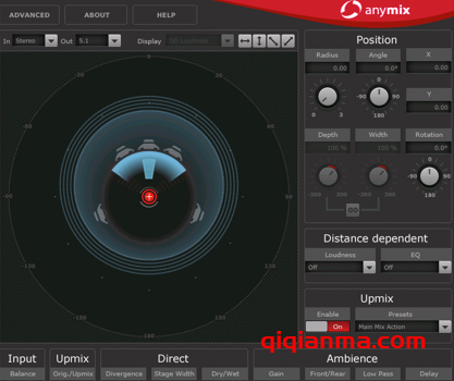 Anymix 的功能远不止于此。该插件可以将任何输入设置(从单声道到 8.1)转换为任何输出格式(从立体声到 8.1)。此外,内置的环绕声声像定位模式可让您深度控制环绕声场中的声道位置。无论是静态声像定位、独立的动态自动化还是纯粹的上混处理,Anymix 都是您的理想之选。