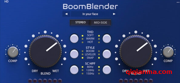 除了单声道和立体声工作外,BoomBlender还包含中音/侧面矩阵,开启了声响和创意的全新可能。该工具允许对中声道或侧声道施加压缩和/或失真,提供对混音空间感的一定程度控制,这对现代制作人至关重要。