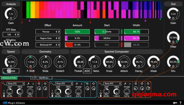 - 频谱效果包括滤波器、幅度调节器、音高和频移器、音频冻结器、数据压缩器、毛刺处理器和限幅器——每一个都可以作用于不同的、独立可调的频带