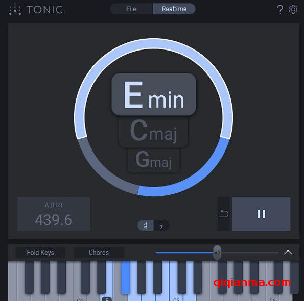 将TONIC插件放在任何音轨上,然后在 DAW 中播放。TONIC将实时分析声音并为您提供最多三个建议的键,并以图形表示显示置信度。折迭按键面板并尝试建议按键的音符和和弦以找到完美契合。