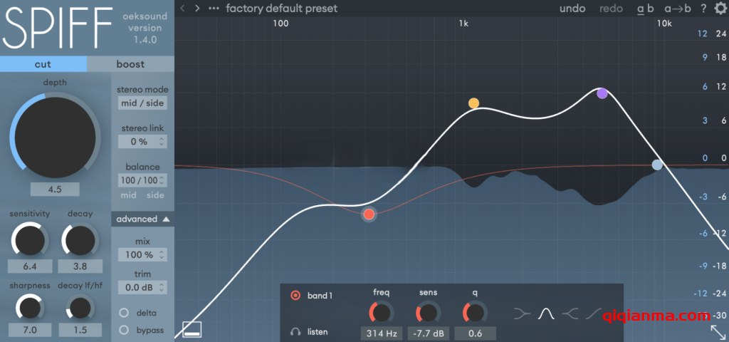 spiff处理瞬态的方法与缓解共振的方法相同。通过仅在需要的地方和时间做出反应,spiff能够衰减甚至消除声音中的瞬态信息。它可有效处理口中的声音,硬辅音,咔嗒声和pop啪声,例如,还可以用来减轻吉他录音中的拾音声,同时保持高端光泽。进入升压模式会使spiff变成强大的瞬态增强器。这使您可以在不增加RMS电平的情况下将元素移到混音的最前面,也可以在不增加额外声音的情况下提高鼓的基本音色。