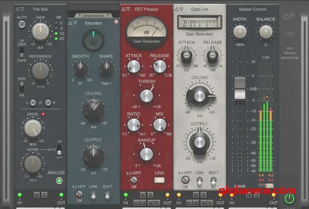 22个独立的处理器分为8类模块(前置模块、滤波器、压缩机、平衡器、限制器、动态模块[扩展器、管道和闸门]、控制和特殊模块),以创建自定义的通道条。