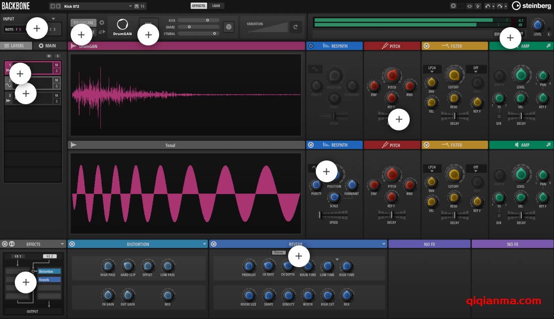 Backbone 是您新的创新鼓设计器,适用于单脚鼓、小军鼓、踩镲、打击乐、上升、击打等。 将多达 8 个样本分层并使用经典减法合成对它们进行整形,将样本分解为音调和噪声元素,重新合成样本以前所未有的方式操纵它们,并使用两条完全可路由的总线应用多达 8 种效果——所有这些都具有光滑、极快的功能 界面。 Backbone 将您的鼓带入一个全新的声音设计时代——鼓再合成时代!