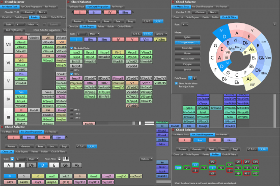 -轻松的和弦输入从和弦选择器,五分之圆图表,MIDI键盘,或电脑键盘。和弦选择器提供“和弦列表”,“刻度度”,“调色板”,“和弦生成器”和“五度圆”。