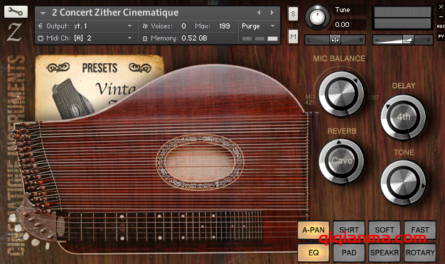 这些音符是用两个不同的麦克风录制的:一个大振膜电容对和一个经典的动圈麦克风。为了塑造声音,我们添加了一个复杂的脚本来实现 Concert Zither 的许多变化。除了主要的复杂补丁外,我们还提供了另外 4 个有用的 FX 补丁:滑音(由调制轮控制)、旋转、驱动和八度。在这里,您可以找到各种稀有和非凡的 FX 弦乐音色。