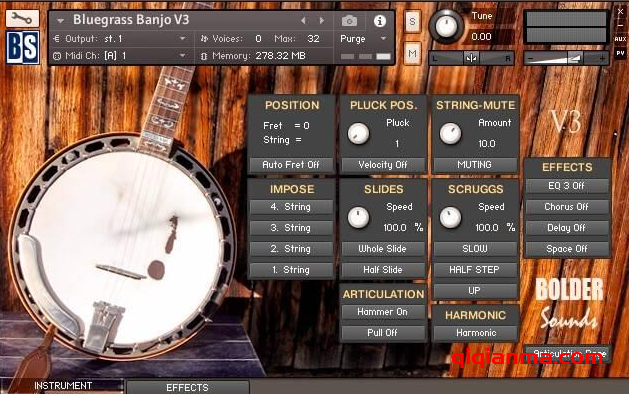 我们使用的班卓琴是 5 弦班卓琴,桃花心木琴体直径为 33 厘米。我们以多种方式演奏和录制班卓琴以获得典型的班卓琴音色——每一种都有几个力度层和 2 个循环变化。在对样本进行编辑和处理后,我们创建了一个提供各种班卓琴风格、缩短音符功能、八度音程、混响旋钮和增强脚本的班卓琴音色。我们还在这个补丁中添加了弹奏班卓琴的声音。结果,我们推出了一款非常逼真和有机的班卓琴。