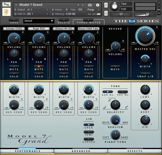 模型7大钢琴是从雅马哈C7大Coda钢琴取样。我们的第一个想法是采样一个CFIII,但当我们去出租的房子,我们完全爱上了这一个,并选择了它。这种特殊的钢琴自80年代以来一直在都灵(意大利)两个备受赞誉的音乐厅使用,多年来一直由米歇尔彼得鲁奇尼和奇克科里亚等艺术家演奏。这架钢琴由技术高超的意大利技术人员经常维修。我们在一个中等大小的大厅里,在一堆麦克风的包围下,品尝了这架钢琴的小怪物。
