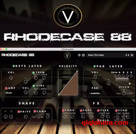 Rhodecase88 采样自一架不太完美修复的 1978 年 Rhodes® Mark I 手提箱电钢琴,配有定制前置/运算放大器,由格莱美提名键盘手 Chris Cadenhead(Terrace Martin、Robert Glasper、杰克逊一家、KC 和阳光乐队)。