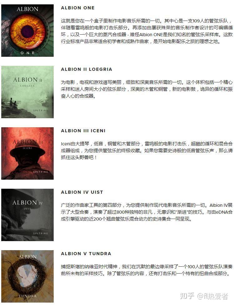 Albion one:主要组成为一支109人组成的管弦乐队。并包含着雷鸣般的打击乐器部分。加以屡获殊荣的乐句循环,以及一个巨大的蒸汽合成器。这也是这款行业标准产品为什么非常适合初学者以及行业作曲家的原因之一。(手打好累,顶不住,上图了。)