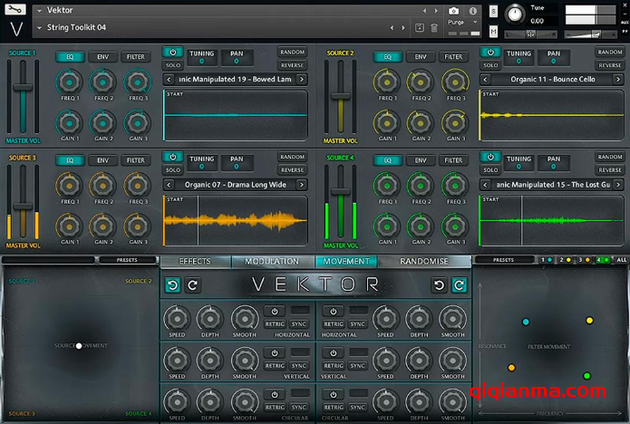 “Vektor”允许通过一组独特的参数以多种方式变形和操纵样本声源,让您想象中的任何想法轻松转换为声音。从其独特的“过滤器移动”和“源移动”操作到其创新的“拖放”功能,没有声音是不可能的。四个声源中的每一个都可以通过整个参数范围独立调整,使可能性无限。