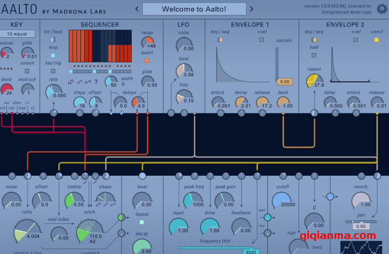 Aalto 既可用于演奏单个音符,也可用于音序模式。每个声音都有一个单独的内置音序器,具有可修补、独立可控的速率和偏移。这种拓扑结构使构建复杂的、不断发展的纹理变得容易。
