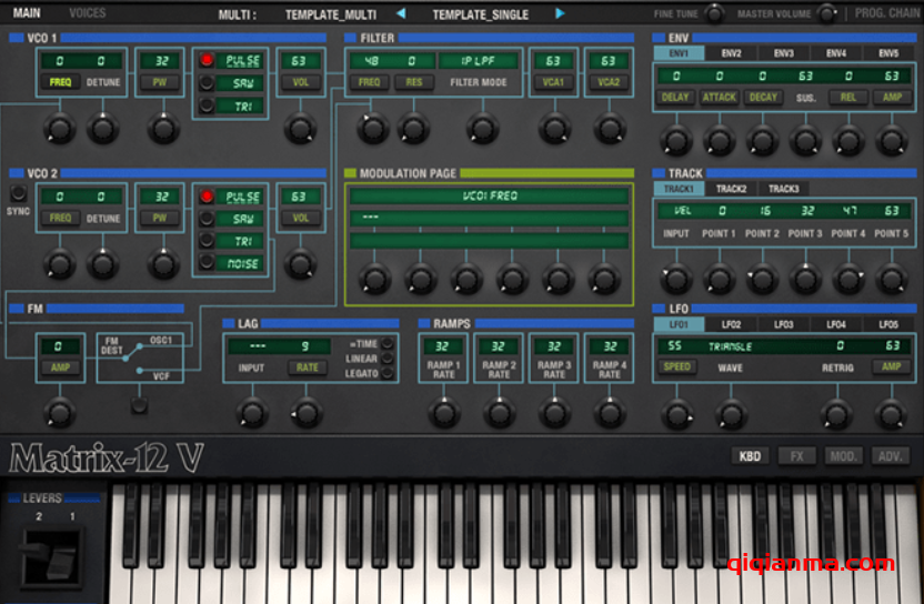 来源包括5个信封,5个LFO,4个斜坡,3个音轨发生器,速度,压力,键盘跟随等等。