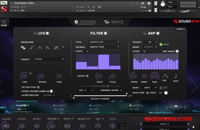 该库配备了一个适应性强的LFO系统,具有可选择的LFO形状,调制目标参数,速度,强度,节奏同步和渐近时间。您还可以选择12个低通,高通和FX滤波器,具有可分配的调制目标,如速度,modwheel,表达式,后触,键位置和步进序列表控制。我们可定制的arpeggiator提供了一个速度表和控制arp方向,定时,摆动,随机化和持续时间。我们已经包括了一个键和尺度锁定系统,以约束您的音符到常见的尺度和键,轻松的旋律组成和现场表演。