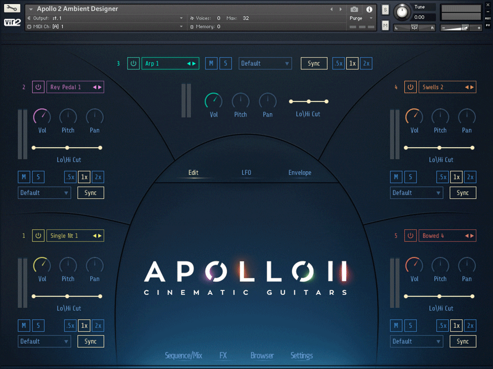 Apollo 2 拥有许多强大的声音塑造工具,包括 9 种 LFO 效果器和一个 6 步音序器,可应用于每个引擎以添加微妙的运动或复杂的节奏效果。用特殊的 AHDSR 塑造每一个声音,并应用连奏来创造令人难以置信的主音。翻转和更改任何表演的播放速度,将阿波罗 2 号吉他完全变成超凡脱俗的东西!