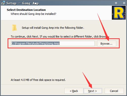 2.点击browse更换软件安装目录,默认目录:C:\Program Files\AudioThing\Gong Amp,如图