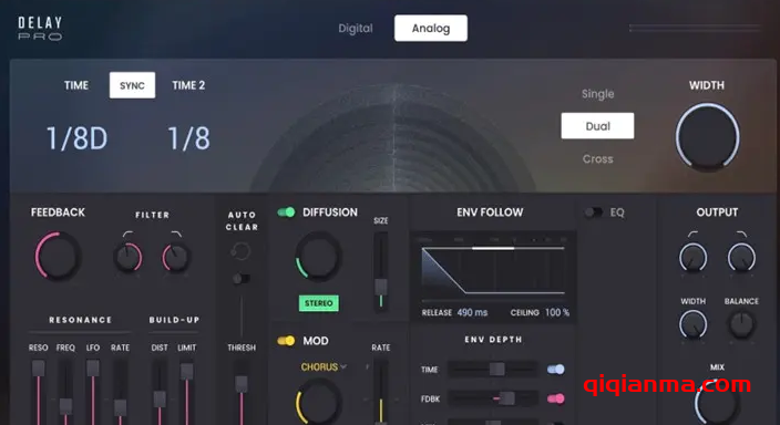 可分配给时间、反馈和混音参数的强大包络跟随器带高通和低通滤波、宽度、平衡和混音控制的