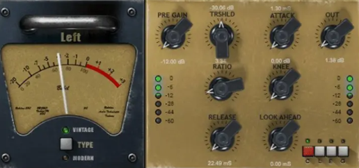 The Vintage/Modern options vary the attack and release characteristics of the processor and will vary the ‘colour’ of the output. Switch between them to hear the difference and select what works for you. This switch has more to do with ‘colour’ or ‘feel’ of the sound.